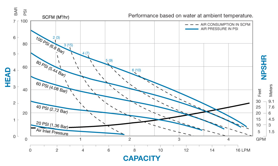 接口尺寸 1/4" BSP Parallel 流量 0 to 4.75 gpm (18 lpm) 气阀 No-lube, no-stall design 可通过物体颗粒最大规格: 1/16" (1 mm) 最大扬程: 125 psi or 298 ft. of water (8.6 bar or 88 meters) 冲程: .048 gallons (.015 liters) 最大压力: 125 psi (8.6 bar) 离岸重量: 不锈钢: 8.82 lbs. (4.0 kg)