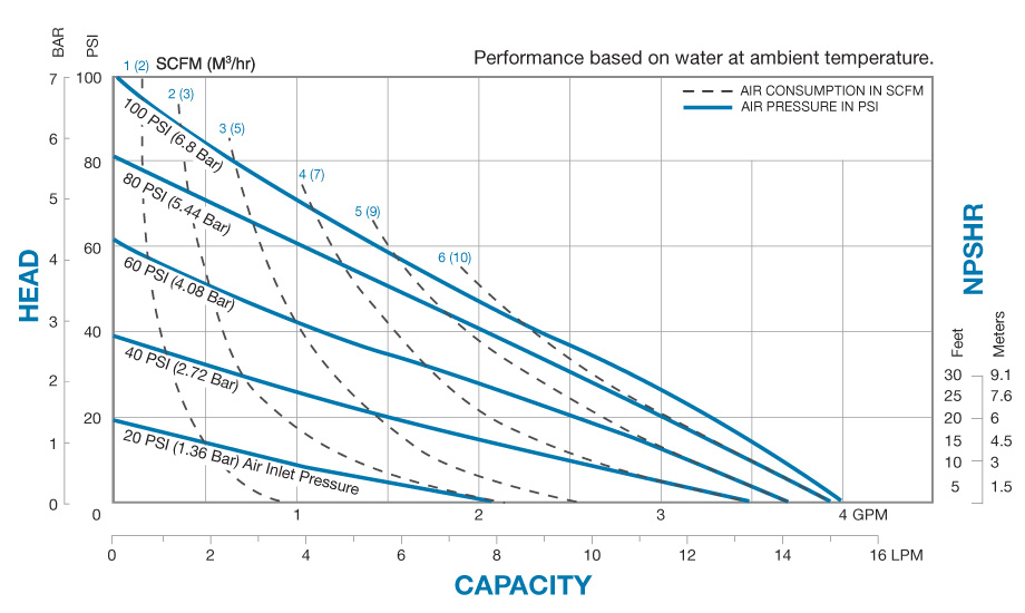 尺寸 1/4" NPT (Internal) 1/2" NPT (External) 流量 0 to 4 gpm (15 lpm) 气阀 qiNo-lube, no-stall design 可通过物体颗粒尺寸 1/32" (1 mm) 扬程 100 psi or 231 ft. of water (7 bar or 70 meters) 最大压力 100 psi (7 bar) 离岸重量 Polypropylene: 4 lbs. (2 kg) PVDF: 5 lbs. (2.5 kg)