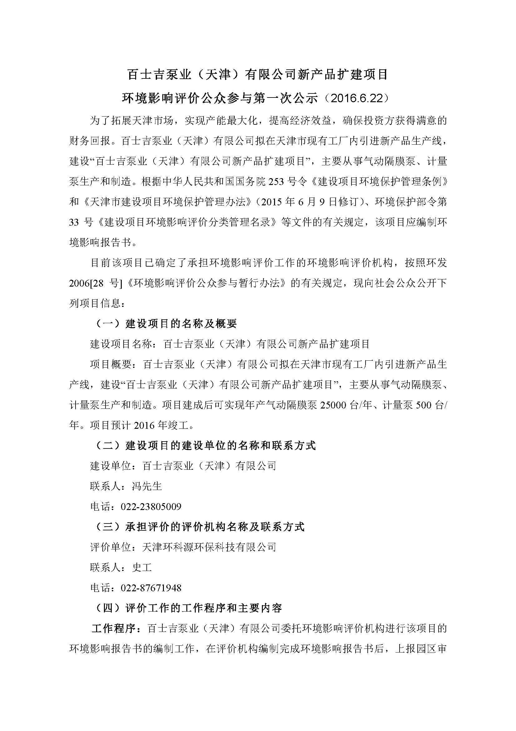 百士吉泵业(天津)有限公司新产品扩建项目环境影响评价公众参与第一次公示